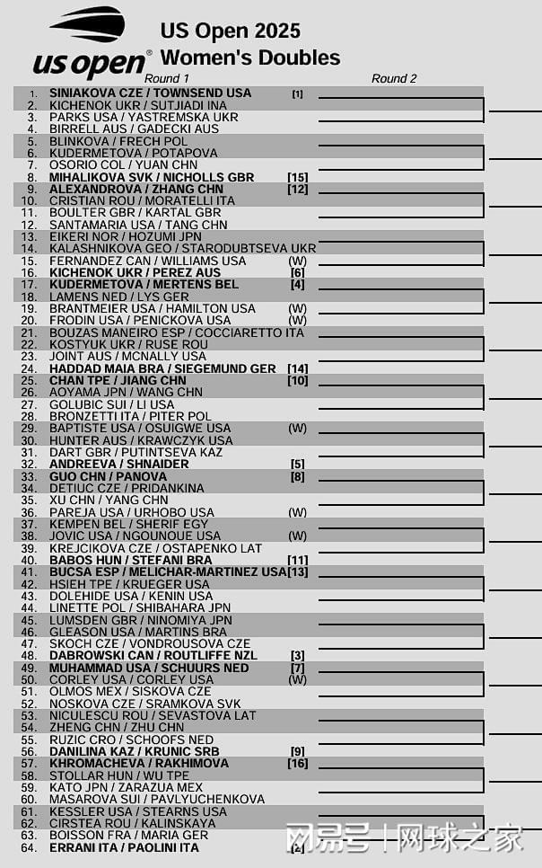 北京时间昨晚,美网女双签表新鲜出炉,捷美组合西尼亚科娃/汤森德、意大利强档埃拉尼/鲍里妮作为前二种子领衔。中国有11朵金花出战,她们首轮的对阵如下:袁悦/奥索里奥 vs米哈利科娃/尼科尔斯、张帅/亚历山德洛娃 vs 克里斯蒂安/莫拉特利、汤千慧/桑塔玛利亚 vs 博尔特/卡塔尔、蒋欣玗/詹皓晴 vs 王雅繁/青山修子、郭涵煜/帕诺娃 vs 德提乌克/普里丹金娜、徐一璠/杨钊煊 vs帕雷哈/乌尔霍博、郑赛赛/朱琳 vs 尼库莱斯库/塞瓦斯托娃。祝金花们好运!